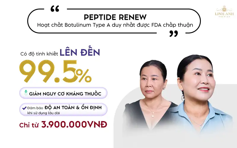 Peptide Renew là hoạt chất tăng sinh trẻ hóa được FDA chấp thuận, giúp thư giãn cơ chọn lọc và tác động chính xác vào nhóm cơ gây nhăn. Hiệu quả đã được chứng minh với khả năng giảm trung bình 37% nếp nhăn trán và 60% vết chân chim, tập trung cải thiện biểu cảm, ánh nhìn và thần thái.